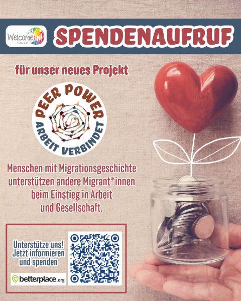 Wir möchten im nächsten Jahr unser neues Projekt PeerPower - Arbeit verbindet an den Start bringen. Wir beantragen dafür eine Förderung in Höhe von 80% des Gesamtvolumens. Die restlichen 20% müssen wir selbst tragen. Da so gut wie alle unsere Angebote kostenlos sind, haben wir fast keine Einnahmen.