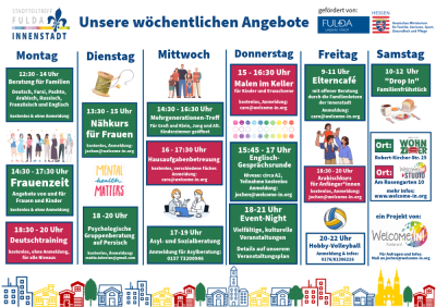 In den 260 m² großen Räumen des Vereins Welcome In! Fulda e.V., dem Wohnzimmer und dem Studio, finden jede Woche viele Angebote und Veranstaltungen von und für Bürger*innen statt.